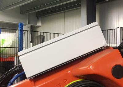 Die Option „Medienverlegung Oberarm“ beinhaltet die Montage einer elektrotechnischen Unterverteilung auf dem Oberarm eines Roboters.