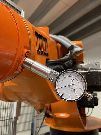The adjustment dial gauge aligns the mechanical position and the electronic position of the robot. Additionally, the adjustment dial gauge can be used to determine the backlash of the robot gears.
